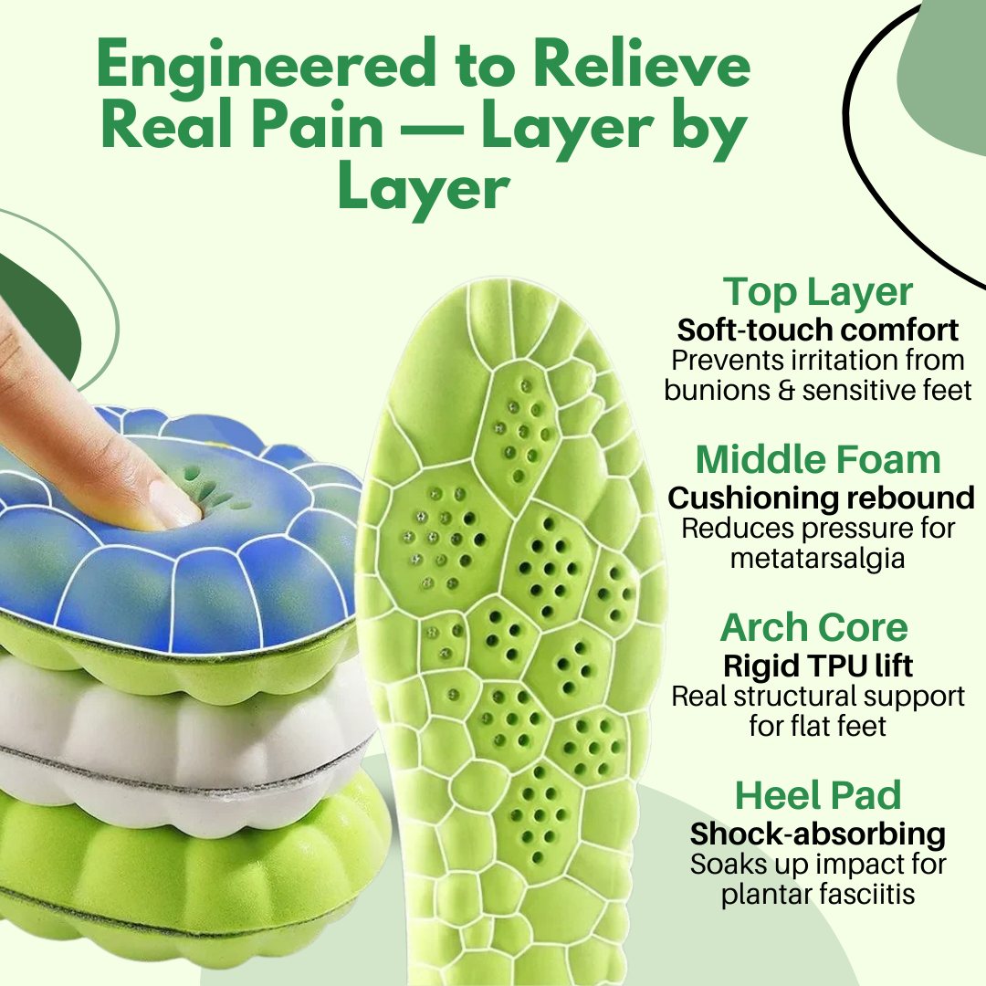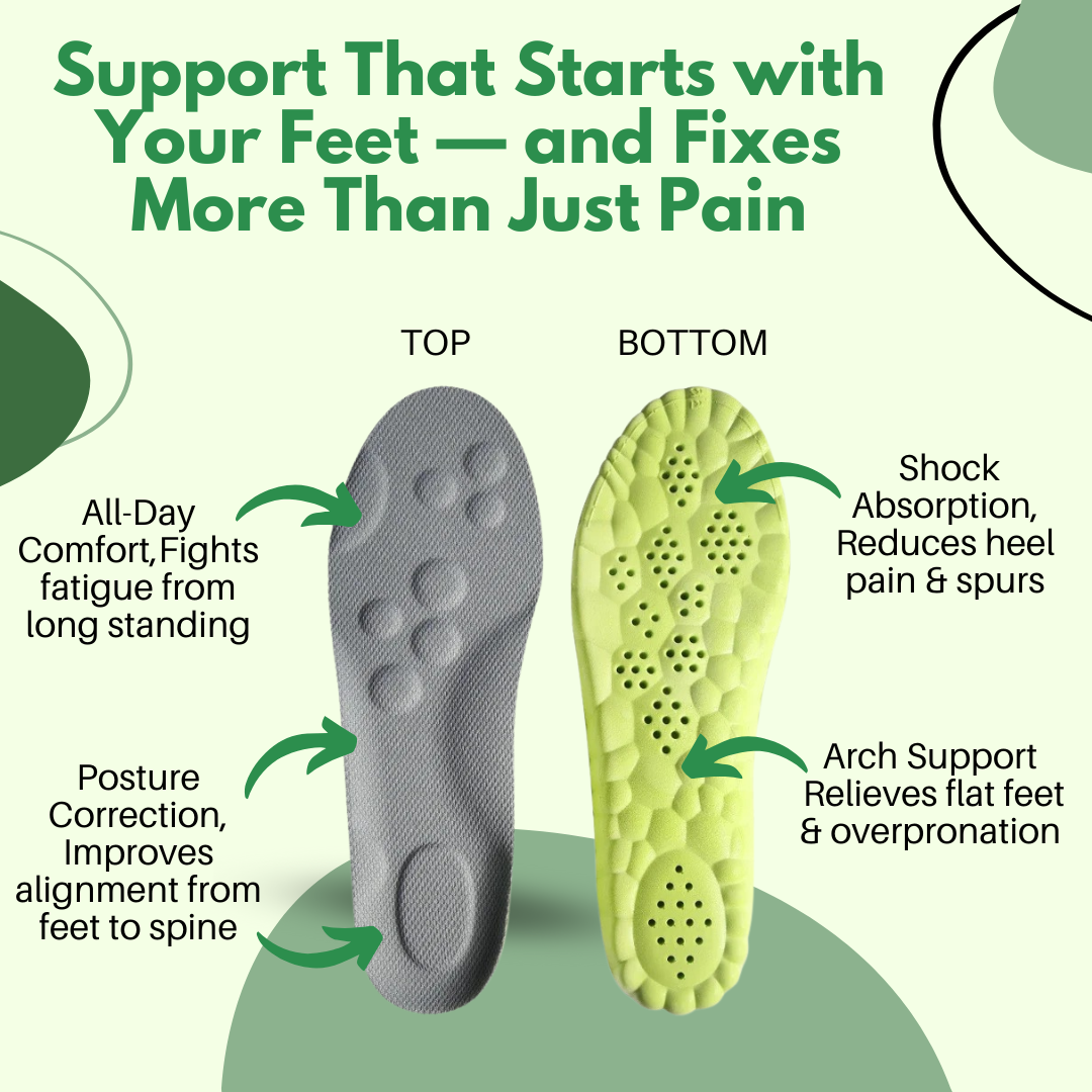 SensaStep™ Relief Insoles are designed to ease pain from plantar fasciitis, flat feet, bunions, heel spurs, and overpronation. They also reduce fatigue from long hours on your feet — helping improve alignment and prevent strain in your knees, hips, and lower back.